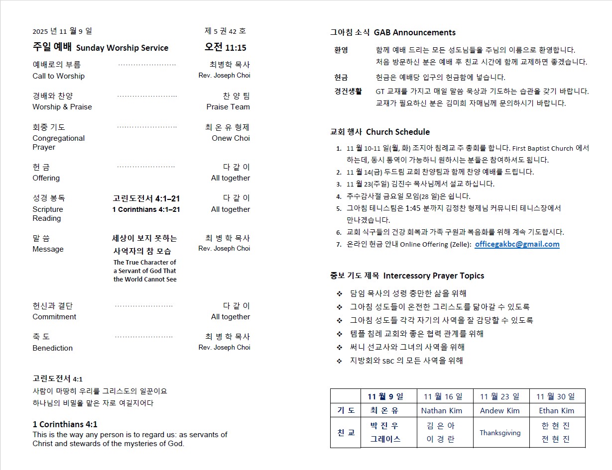 11월 9일 교회소식